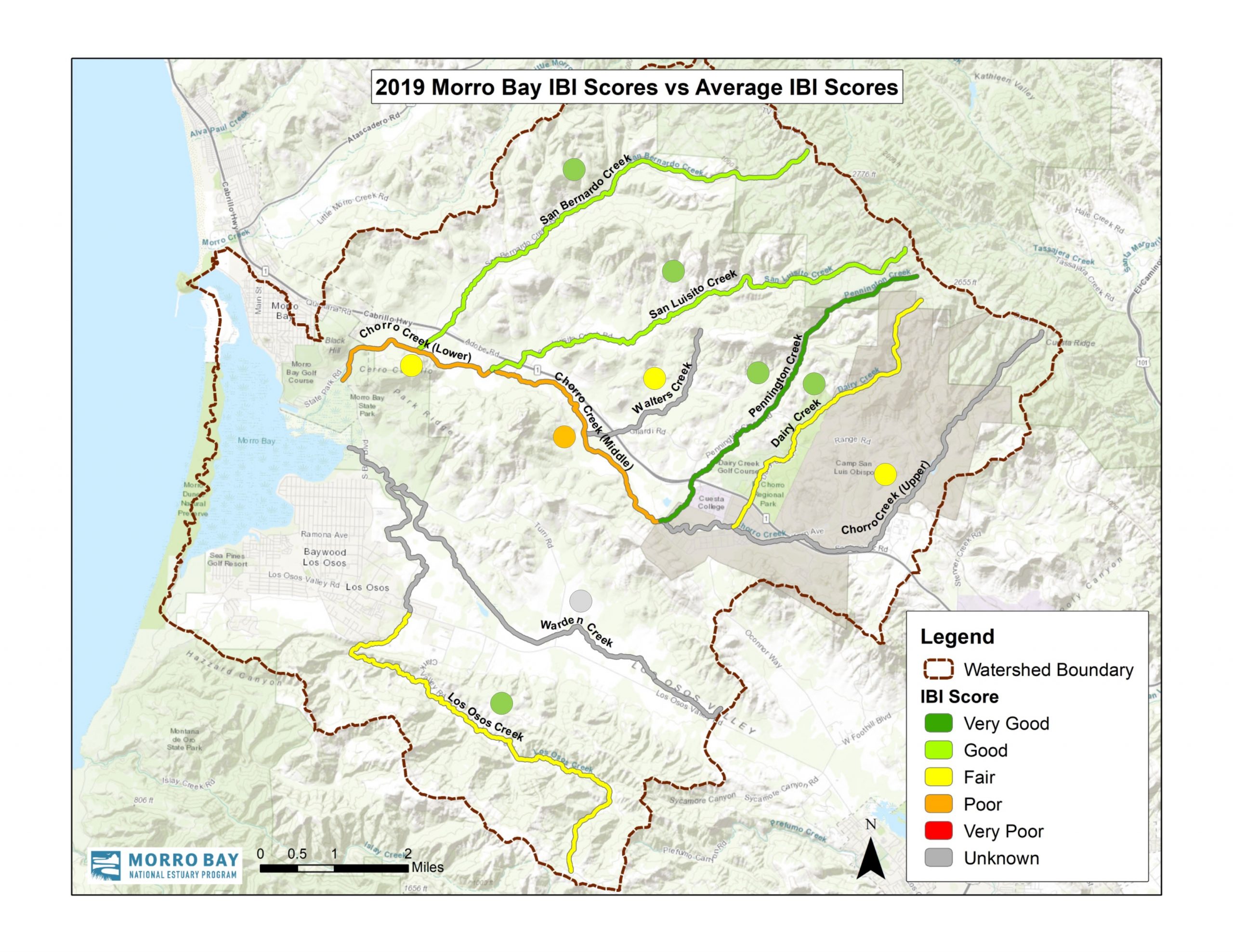 The map below shows the creek health scores for the Morro Bay watershed in 2019. The score we are using is called an Index of Biotic Integrity (IBI). This score was calibrated specifically for our part of the state.