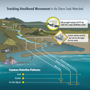 This diagram shows approximate locations where fish were tagged and the locations of the antennae that track fish movement. The diagram shows that smolts (fish journeying from fresh water to salt water) would pass all three antennae without turning back. The resident fish never ventured into the lower parts of Chorro Creek or beyond into the saltwater habitat. And two-way migrants were fish that as part of their smolting journey spent time in the estuarine habitat (a mix of fresh and salt water) before venturing out into the open ocean. Figure courtesy of Stillwater Sciences.