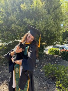 Bella celebrating with her cat Roo after walking in Cal Poly’s Master’s graduation ceremony earlier this summer.