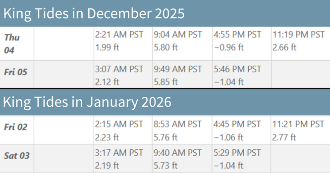 About once a year, the perihelion, perigree, and spring tides all occur at the same time. This combination of forces causes the highest and lowest tides of the year that are commonly referred to as “king tides.” Here in California, these generally occur in late December or early January.