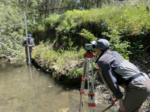 WSP Corpsmembers, Maeve and Shannon, work together to measure slope on Dairy Creek.