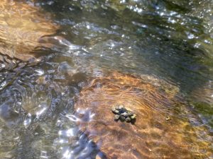 Benthic macroinvertebrates are aquatic insects that live below the water surface and are considered indicators of stream health. The insect pictured above is a caddisfly larva, which builds itself a protective casing using materials found in the environment like sand, pebbles, or plants. Caddisflies are considered indicators of good water quality.