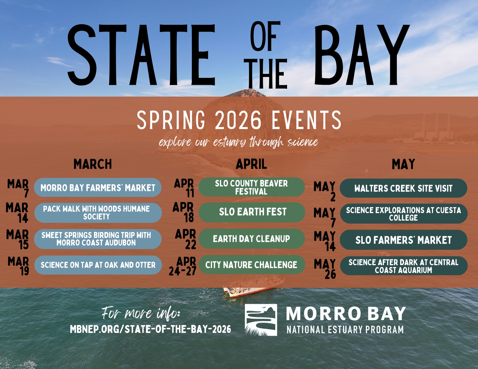 In addition to publishing and distributing the report, the Estuary Program hosts and attends a variety of outreach events throughout the spring. These events help to increase public engagement with and understanding of the Morro Bay estuary and watershed. This year, we are hosting or attending over a dozen events between March and May. See below for more information on these events and how to get involved.