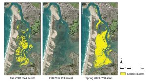 his series of maps illustrates the large swings in eelgrass acreage (shown in yellow) observed in Morro Bay. Eelgrass acreage declined from 344 acres in 2007 to only 13 acres in 2017. Around this time, small patches of eelgrass began appearing in areas that had experienced loss. Eelgrass has been steadily increasing since then, with 750 acres mapped in 2023.