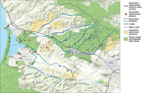 This map shows the lands that are conserved and protected through public ownership, easements, and private preserves. The map also illustrates the locations of projects such as floodplain restoration, invasive plant removal, and stormwater management infrastructure.