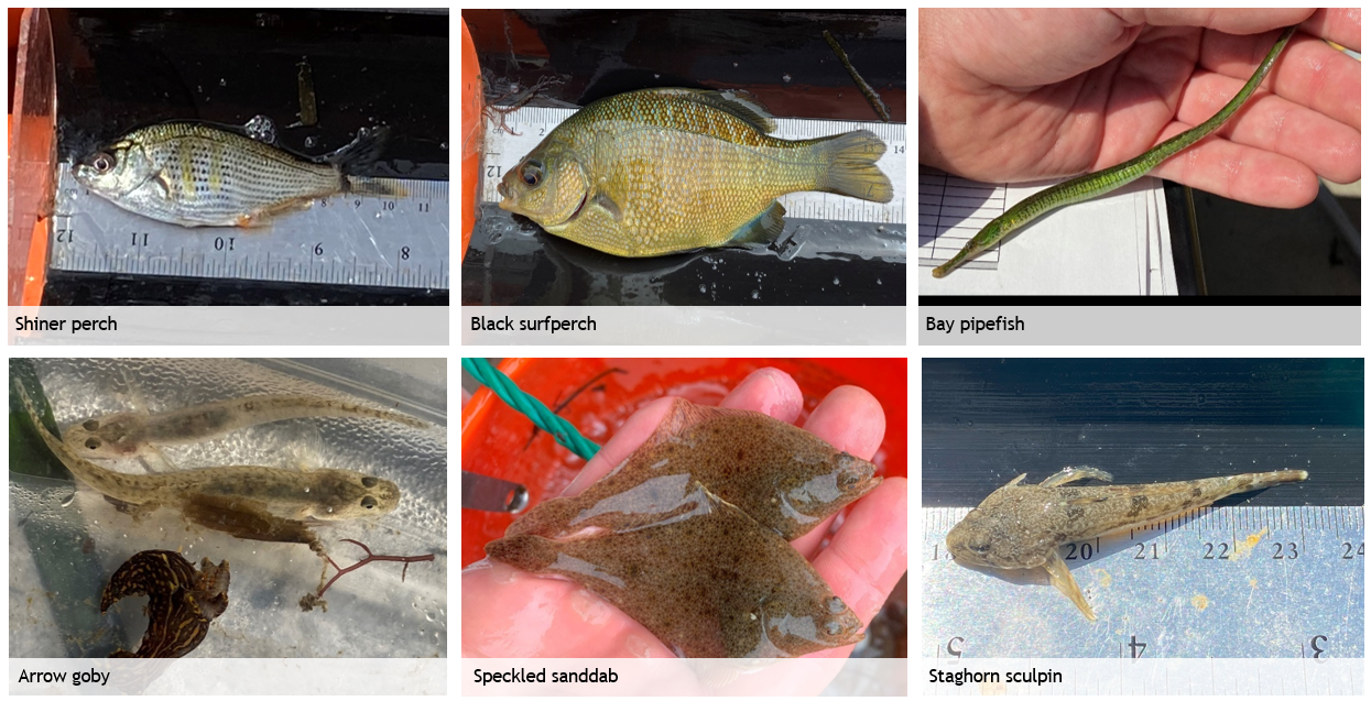 As you can imagine, the bay with 750 acres of eelgrass looks very different than the bay with only 13 acres. The Estuary Program and our partners were interested in understanding how the fish populations shifted with these changes in eelgrass. In 2006 and 2007, Dr. John Stephens of Occidental College conducted a baywide fish study when eelgrass covered approximately 344 acres of the bay. Nearly a decade later, Dr. Jennifer O’Leary of Cal Poly and Sea Grant repeated this work when the eelgrass had declined to only 13 acres. In 2023 and 2024, the Estuary Program completed similar monitoring efforts when eelgrass was at a record high of 750 acres.