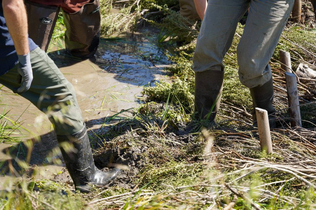 Beaver dam analogs (BDAs) are structures that mimic the effects of a dam built by beavers on a creek. They promote the ponding of water and deposition of sediment behind the structure. Deposited sediment raises the elevation of the channel bed, which helps to reconnect the channel to the adjacent floodplain habitat. The structures have a ramp of sediment on the upstream side and a lattice of brush and wood on the downstream side. The front of the structure acts like a filter, slowing down the water’s path through mud and vegetation.