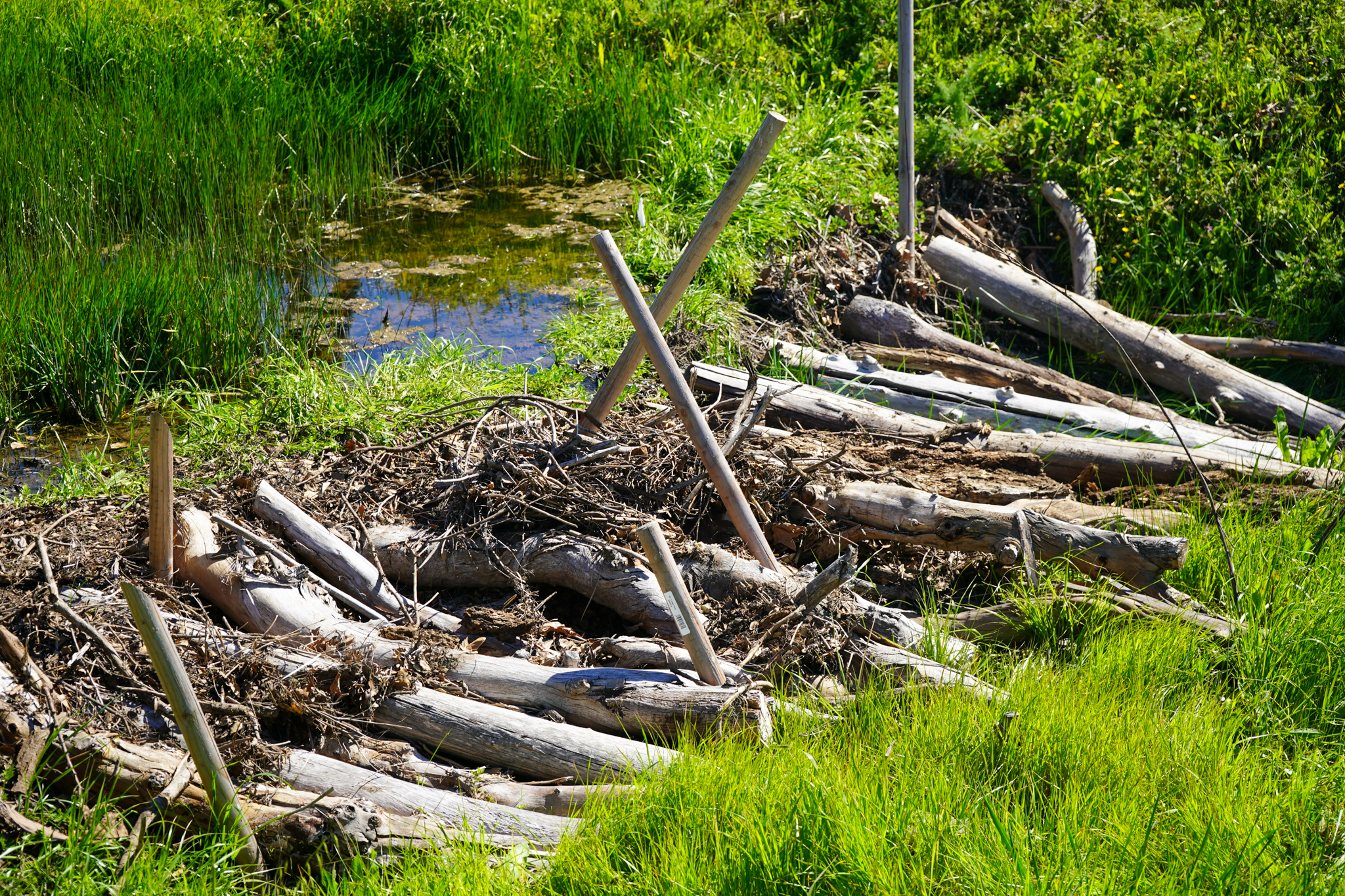 Beaver dam analogs (BDAs) are structures that mimic the effects of a dam built by beavers on a creek. They promote the ponding of water and deposition of sediment behind the structure. Deposited sediment raises the elevation of the channel bed, which helps to reconnect the channel to the adjacent floodplain habitat. The structures have a ramp of sediment on the upstream side and a lattice of brush and wood on the downstream side. The front of the structure acts like a filter, slowing down the water’s path through mud and vegetation.