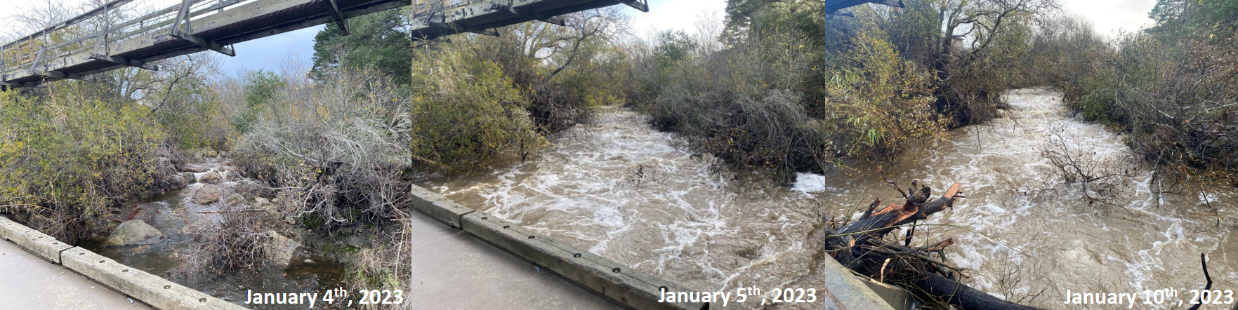 This series of photos shows changes in creek flows at Chorro Creek in January 2023. Between January 5 and January 10, the water level reached 23 feet, with the bridge under about ten feet of water. In the photo on the right, debris from the severe storm can be seen piled up against the bridge. A total of 5.35 inches of rain fell on January 9, the highest rainfall since historic flooding in March 1995 when 6.77 inches of rainfall were recorded.
