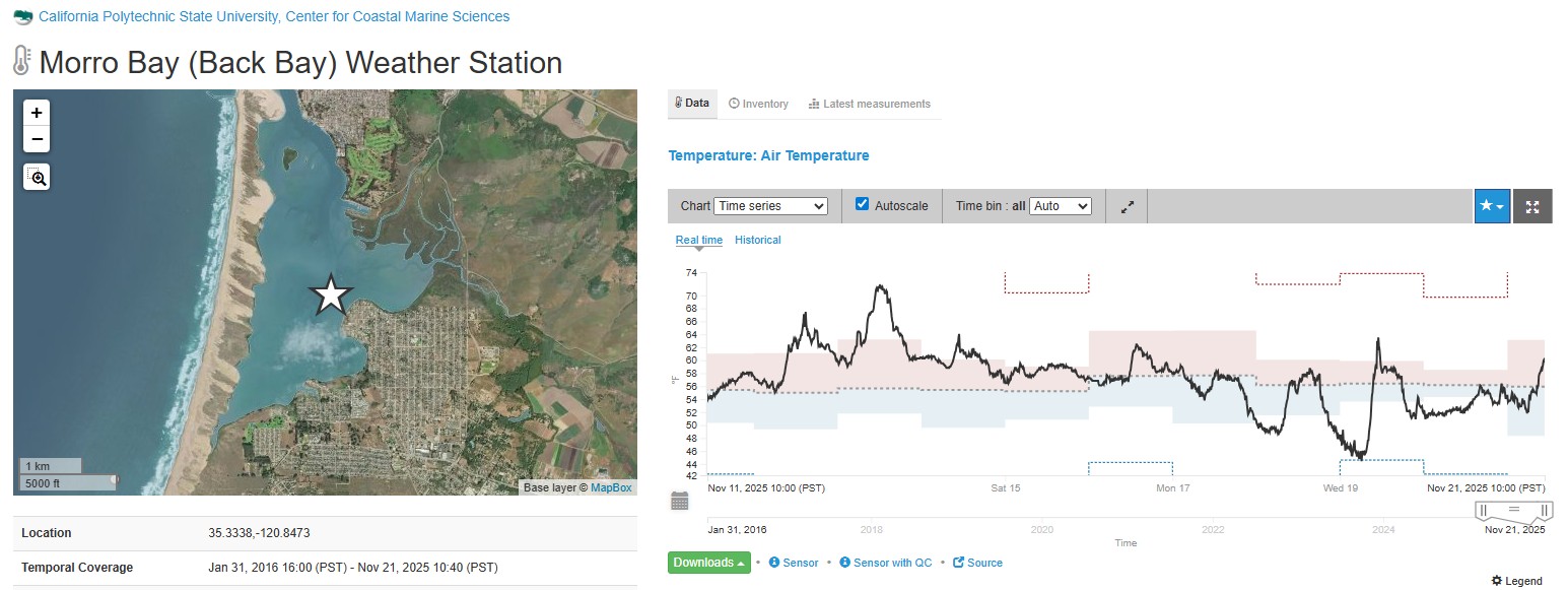 If you’re preparing to go out on the water and are interested in weather conditions in the Morro Bay estuary, the Central and Northern California Ocean Observing System (CeNCOOS) operates a weather station in the back bay, which uploads real-time data to an online dashboard. The weather station is co-located with a suite of water quality sensors that are maintained by researchers at Cal Poly, which are covered in further detail in our Water Quality indicator section.