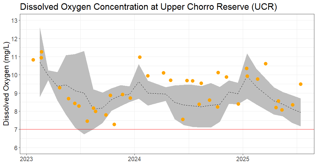 Dissolved oxygen (DO) readings taken during monthly monitoring visits (orange) and DO collected by continuous sensors (dashed line represents average DO and the gray shaded ribbon represents one standard deviation above and below the average) at a Chorro Creek site upstream of the Chorro Creek Ecological Reserve. The continuous deployments allow us to track the variability of DO throughout the month. The instantaneous readings can miss when DO drops below protective standards (red line), as it did in July 2023. Additionally, instantaneous sampling is typically conducted during the day, when DO is at its peak and may not be representative of average conditions.
